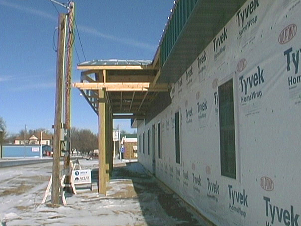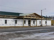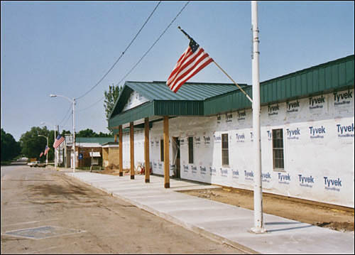 On December 31, 2002, construction began in Rolfe on a new community center. It will house the public library, city hall, and a large meeting area. The above photo is a reasonable facsimile of what the Rolfe Enrichment committee envisions for completed building. In early January of 2003, the Fort Dodge Messenger published a feature story about the project. The photo below shows Rolfe's downtown (or uptown) Main Street district in the 1960s. The camera faces north, northeast. All the tall buildings on the east side of the street are gone. The new community center is being built in the area where the tallest buildings on the right (with the double set of awnings) once stood. The photo is from Lorene Hansen's collection. |