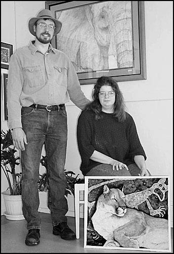by Sylvia Olson Their exotic faces peer at you snow leopards, macaws, giraffes, elephants. Their wild animal spirits shine through their eyes. Where are we - in some jungle? A zoo? No, we're in Rolfe, Iowa, at the newest business in town the Wild Faces Studio Gallery and Frame shop. Mona Majorowicz and her husband Mike opened the gallery November 1, and have been pleased with the response to their offering. So far about two-thirds of the business has been in picture framing, and a third in sales of Mona's art. Mona, a self-taught artist, creates "unique, up close portraits of wildlife and horses," working primarily with water-soluble colored pencils. The effect is stunning vivid and detailed images of individual animals who almost seem to come to life. The compositions are sophisticated, almost abstract in their balance of light and dark, but highly realistic as well. "Wildlife is the only subject I feel passionate about," said Majorowicz. The passion is clear in her work, which she bases on personal encounters with the animals she portrays. "I love taking photographs of animals, and use these as the basis for my work," she said. MONA GREW UP IN tiny (pop. 150) Marietta, Minn., in an artistic family, and spent her time riding horses, exploring nature, and drawing. A special teacher in high school encouraged her artwork, but she decided to study veterinary technology at National College in Rapid City, South Dakota, and worked at a vet clinic, horse stable, greyhound kennel, and Bear Country, a wildlife park, where she helped raise wolves, bears and mountain lions. Meanwhile, she kept drawing. She met Mike, a Rolfe native, in Rapid City (he had also gone to National College), and they were married ten years ago. About the same time, she started using watercolors and colored pencil, and turned to art professionally, as a picture framer and animal portraitist. Mike made her a drafting table, and encouraged her to follow her dreams. In 1995, the couple moved back to Rolfe, where Mike is an organic farmer with other members of his family. They raise organic oats, corn, hay, and soybeans which are used for making tofu. During the summers, Mona and Mike are busy with art shows all over the Midwest. Mona's techniques are detailed and exacting, and she may complete only ten pictures a year. To expand her inventory, Mike (whose training was in computers and data processing) started producing quality prints of her animal portraits. So if you visit the gallery, you have the choice of purchasing an original work (ranging from $600-1200) or a print ($20-60), or even a card ($2, or 6 for $10). The prints are produced with archival inks, so they are just as vivid and long-lasting as the originals. In addition to art shows and the new gallery, Mona's work is displayed at the Des Moines Zoo and at several galleries, including the Witter in Storm Lake, Arts on Grand in Spencer, Treloft Gallery in Fort Dodge, Eyes of Nature in Milford, Oscar Howe in Mitchell (SD), Whispering Pines in Deadwood (SD), and - one of Mona's favorite places in the world - the Black Hills Wild Horse Sanctuary in Hot Springs, SD. She hopes to expand to the Omaha and Denver zoos next year. IT'S WORTH A TRIP to Rolfe to visit the Wild Faces Gallery. You'll feel like you have been on a safari to Africa (a future goal for Mona), and you may leave with a very special gift for yourself or another animal-lover. The gallery is just across the street from the Post Office, and is open Tuesdays through Saturdays from noon to 5 p.m. If you can't visit and want to browse, check out their website at www.ncn.net/~mmajorow. |