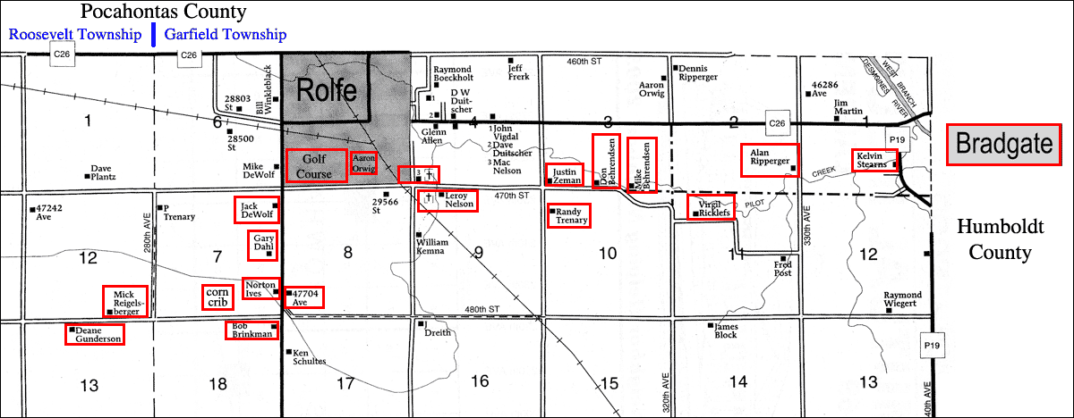 | This map joins portions of the directories for Roosevelt and Garfield Townships that were in the 2003 Plat Book for Pocahontas County. The red areas incurred storm damage. You can click on the map for a larger version. | |||