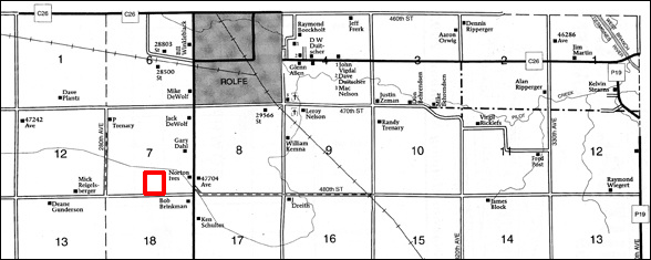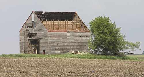 | This corn crib is all that is left of a farmstead that has been owned by various families over the past 120 years. The Gary and Kathy Dahl family own the place and use the crib to store bales and grain. The tornado blew the roof off with debris scattered at least as far away as a half mile. |